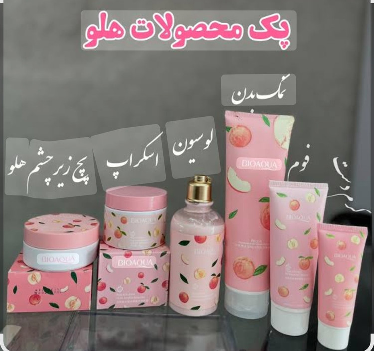 پگ محصولان هلو شامل نمک بدن ۱۵۰۰ ، لوسیون ۱۲۵ ، پچ زیر چشم ۱۶۰ ، اسکراپ بدن ۱۳۵، فوم ۹۰ ، کرم دست ۵۰